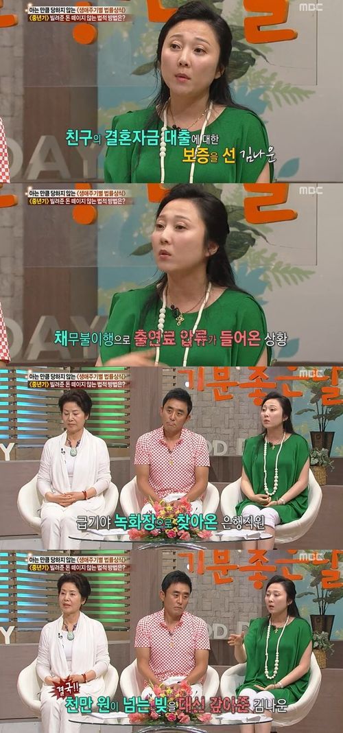 김나운은 10일 방송된 MBC ‘기분 좋은 날’에서 친구 결혼자금 대출한 것에 대해 빚보증을 섰다가 출연료압류가 들어왔던 경험을 공개했다.