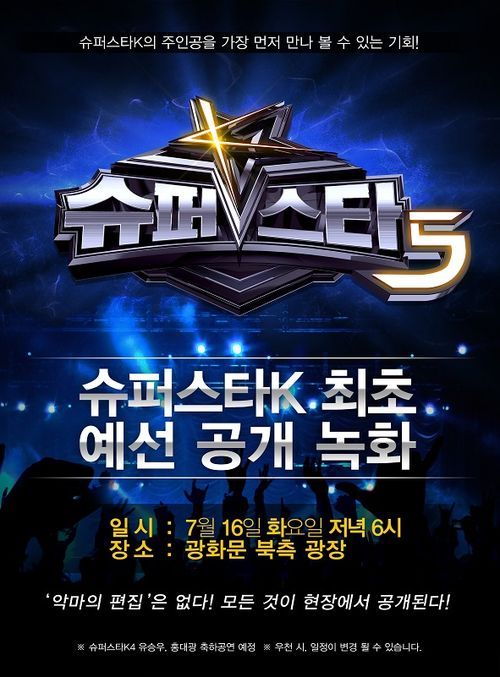 '슈스케5'는 오는 16일 오후 6시부터 서울 광화문 광장에서 '슈스케5' 서울 예선 현장 공개 녹화를 진행할 예정이다. 이승철 심사위원이 직접 심사를 맡을 예정이어서 팬들의 기대감을 더욱 증폭시키고 있다.