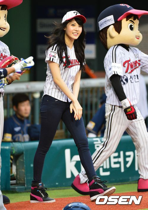 10일 오후 서울 잠실야구장에서 '2013 한국야쿠르트 세븐 프로야구' LG 트윈스 대 NC 다이노스의 경기가 열렸다. 시구자로 나선 걸그룹 걸스데이 유라가 그라운드로 들어서고 있다.
