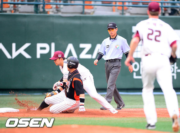 10일 오후 목동구장에서 열린 2013 한국야쿠르트 세븐프로야구 넥센 히어로즈와 롯데 자이언츠 경기, 2회초 1사 주자 2루 롯데 정훈 타석에서 2루 주자 전준우가 3루 도루를 시도했으나, 넥센 선발 밴헤켄이 3루로 볼을 던지며 3루수 김민성이 태그아웃을 시키고 있다.
