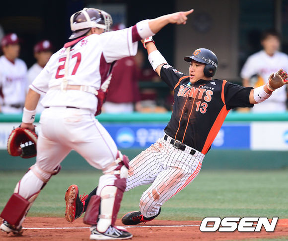 10일 오후 목동구장에서 열린 2013 한국야쿠르트 세븐프로야구 넥센 히어로즈와 롯데 자이언츠 경기, 1회초 1사 주자 1,3루 롯데 강민호의 좌익수 희생플라이때 3루 주자 황재균이 홈으로 쇄도, 선취점을 올리고 있다.