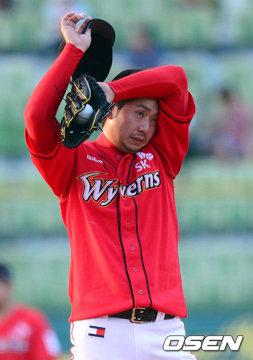 10일 오후 오후 대구 시민운동장에서 열린 '2013 한국야쿠르트 세븐프로야구' 삼성 라이온즈와 SK 와이번스의 경기, 1회말 SK 윤희상이 3실점을 한 뒤 땀을 닦고 있다.