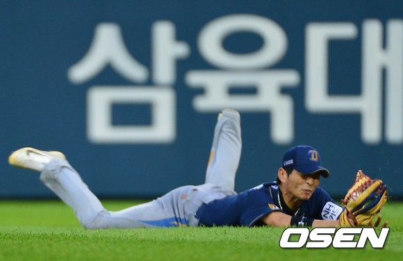10일 오후 서울 잠실야구장에서 '2013 한국야쿠르트 세븐 프로야구' LG 트윈스 대 NC 다이노스의 경기가 열렸다. 4회말 LG 공격 2사 주자없는 상황 NC 우익수 김종호가 8번 윤요섭의 우익수 플라이를 몸을 날리며 잡아내고 있다.
