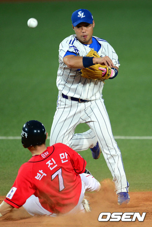 10일 오후 오후 대구 시민운동장에서 열린 '2013 한국야쿠르트 세븐프로야구' 삼성 라이온즈와 SK 와이번스의 경기, 5회초 1사 1루 삼성 김태완이 SK 김강민의 타구를 잡아 1루 주자 박진만을 아웃시키고 1루로 송구하고 있다.