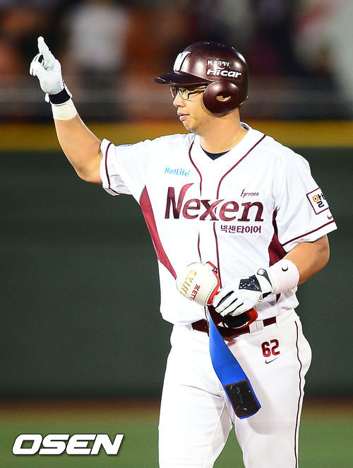10일 오후 목동구장에서 열린 2013 한국야쿠르트 세븐프로야구 넥센 히어로즈와 롯데 자이언츠 경기, 5회말 1사 주자 1,2루 넥센 오윤이 우중간 동점 1타점 적시타를 날린 후 2루에서 사인을 보내고 있다.