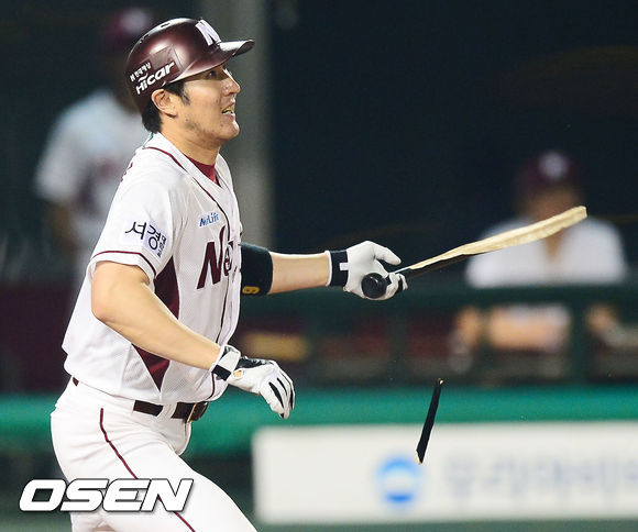 10일 오후 목동구장에서 열린 2013 한국야쿠르트 세븐프로야구 넥센 히어로즈와 롯데 자이언츠 경기, 6회말 2사 주자 없는 상황에서 넥센 유한준이 2루수 플라이 타구를 날리며 배트가 부러지고 있다.