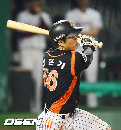 10일 오후 목동구장에서 열린 2013 한국야쿠르트 세븐프로야구 넥센 히어로즈와 롯데 자이언츠 경기, 7회초 1사 주자 2루 롯데 신본기가 좌익수 왼쪽 1타점 적시타를 날리고 있다.