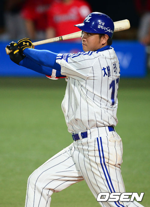 10일 오후 오후 대구 시민운동장에서 열린 '2013 한국야쿠르트 세븐프로야구' 삼성 라이온즈와 SK 와이번스의 경기, 7회말 2사 1,2루 삼성 채태인이 1타점 적시타를 때리고 있다.