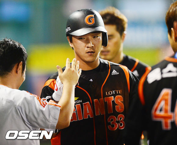 10일 오후 목동구장에서 열린 2013 한국야쿠르트 세븐프로야구 넥센 히어로즈와 롯데 자이언츠 경기, 7회초 1사 주자 2루 롯데 신본기의 좌익수 왼쪽 1타점 적시타때 홈을 밟은 정훈이 덕아웃에서 동료들과 하이파이브를 하고 있다.