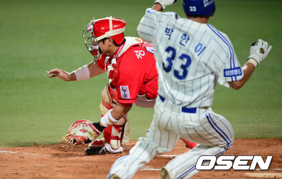 10일 오후 오후 대구 시민운동장에서 열린 '2013 한국야쿠르트 세븐프로야구' 삼성 라이온즈와 SK 와이번스의 경기, 7회말 2사 1,2루 삼성 박한이가 채태인의 적시타때 홈으로 쇄도하고 있다.