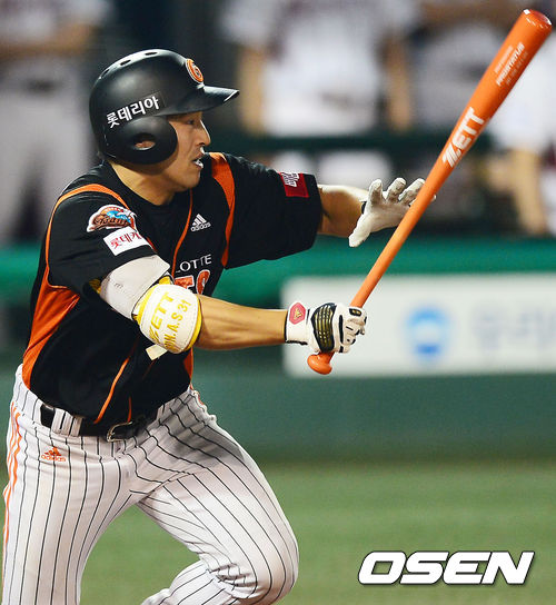 10일 오후 목동구장에서 열린 2013 한국야쿠르트 세븐프로야구 넥센 히어로즈와 롯데 자이언츠 경기, 7회초 2사 주자 만루 롯데 손아섭이 중견수 앞 1타점 적시타를 날리고 있다.