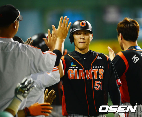 10일 오후 목동구장에서 열린 2013 한국야쿠르트 세븐프로야구 넥센 히어로즈와 롯데 자이언츠 경기, 7회초 2사 주자 만루 롯데 손아섭의 중견수 앞 1타점 적시타때 홈을 밟은 이승화와 신본기가 덕아웃에서 동료드로가 하이파이브를 하고 있다.