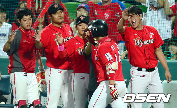 10일 오후 오후 대구 시민운동장에서 열린 '2013 한국야쿠르트 세븐프로야구' 삼성 라이온즈와 SK 와이번스의 경기, 8회초 2사 1,3루 SK 최정이 3점 홈런을 때린 뒤 동료들과 기뻐하고 있다.