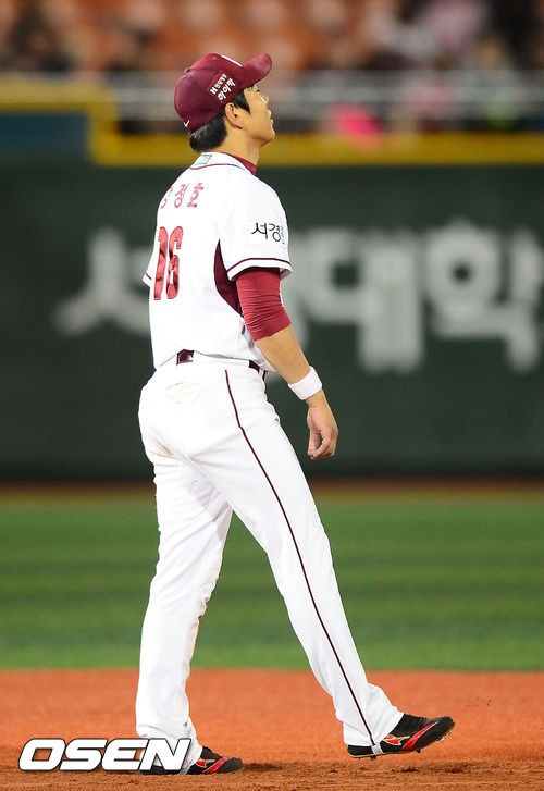 10일 오후 목동구장에서 열린 2013 한국야쿠르트 세븐프로야구 넥센 히어로즈와 롯데 자이언츠 경기, 8회초 1사 주자 1,3루 롯데 넥센 신본기의 타격때 유격수 강정호의 실책으로 병살처리를 하지 못하고 1실점을 하게 되자 강정호가 아쉬워하고 있다.