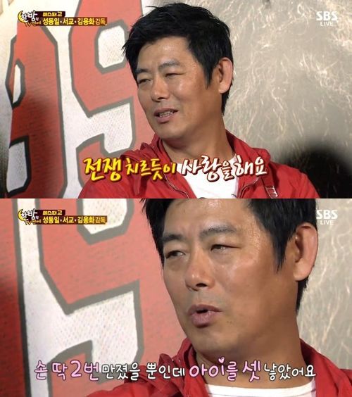 성동일은 10일 방송된 SBS '한밤의 TV연예'에 출연해 "아내와는 손을 딱 2번 잡고 아이를 낳았다. 우리 부부는 전쟁을 치르듯이 사랑을 한다"고 너스레를 떨었다.