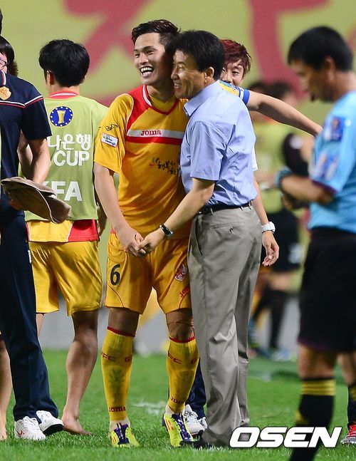 연장 전반 광주 김은선이 선제골을 넣고 여범규 감독과 기뻐하고 있다.