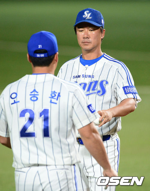 10일 오후 오후 대구 시민운동장에서 열린 '2013 한국야쿠르트 세븐프로야구' 삼성 라이온즈와 SK 와이번스의 경기, 10회초 2사 2루 삼성 김태한 코치가 마운드에 오르는 오승환에게 공을 건네고 있다.