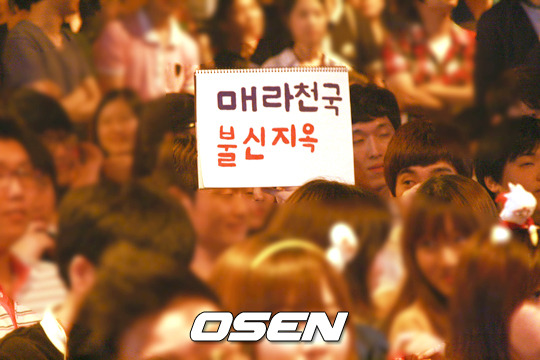 한 관중이 CJ 프로스트의 서포터인 '매드라이프' 홍민기를 응원하는 문구로 경기 전 흥을 올리고 있다.