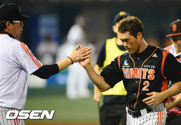 경기를 마치고 롯데 조성환과 김시진 감독이 하이파이브를 하고 있다. / rumi@osen.co.kr