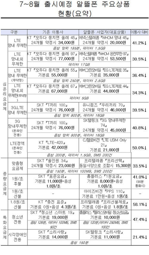 미래창조과학부(장관 최문기)는 11일 기존 이통 3사보다 30~40% 정도 저렴한 새로운 알뜰폰 상품들이 7~8월중 출시될 것이라고 밝혔다.