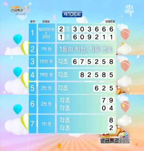 10일 JTBC를 통해 생방송으로 진행된 연금복권520 추첨에서 106회 당첨번호는 1등 2조 303666번, 1조 609211번이 선정됐다.