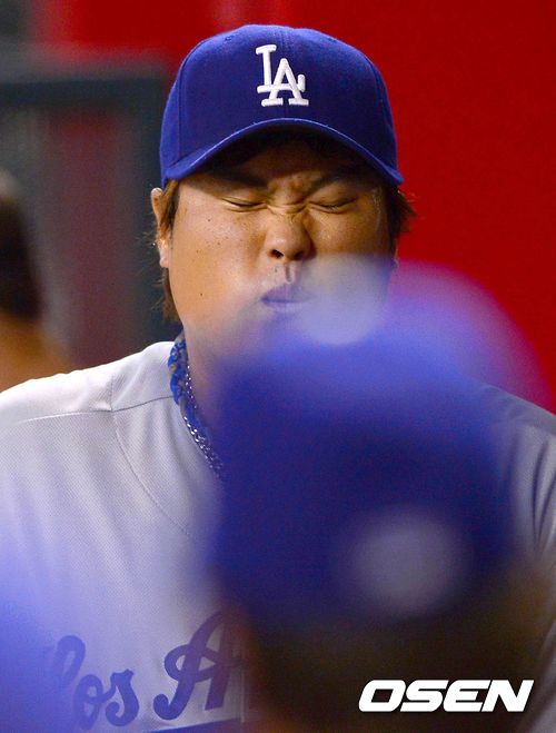 11일(한국시간) 미국 애리조나 피닉스 체이스필드에서 열린 2013 MLB 애리조나 다이아몬드백스와 LA 다저스의 경기 3회말 추가실점한 류현진이 더그아웃에 들어오면서 인상을 찡그리고 있다.