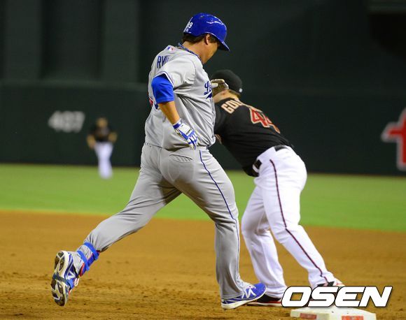 11일(한국시간) 미국 애리조나 피닉스 체이스필드에서 열린 2013 MLB 애리조나 다이아몬드백스와 LA 다저스의 경기 2회초 2사 1,3루 류현진이 내야땅볼을 치고 1루에서 아웃되고 있다.