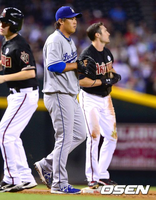 11일(한국시간) 미국 애리조나 피닉스 체이스필드에서 열린 2013 MLB 애리조나 다이아몬드백스와 LA 다저스의 경기 3회말 류현진이 선두타자 폴락에게 3루타를 혀용하고 아쉬워 하고 있다.