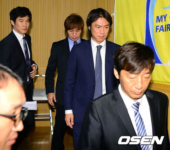 홍명보 감독이 11일 오전 파주 NFC(국가대표 트레이닝센터)에서 열린 '2013 동아시안컵' 대표팀 명단 발표 기자회견을 마치고 기자회견장을 빠져나가고 있다.