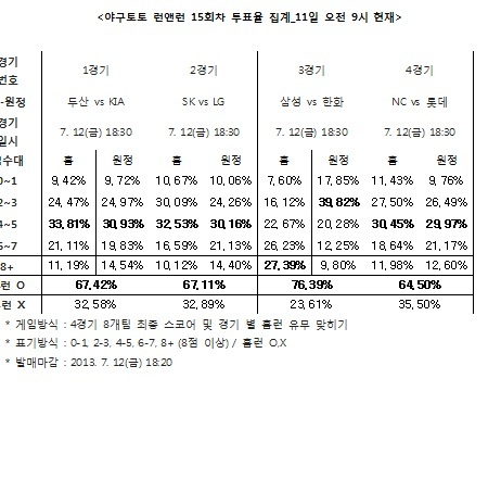 2013 국내프로야구 대상 야구토토 런앤런 15회차 투표율 중간집계 결과
