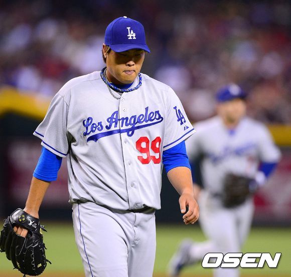 11일(한국시간) 미국 애리조나 피닉스 체이스필드에서 열린 2013 MLB 애리조나 다이아몬드백스와 LA 다저스의 경기 5회말 3실점 하며 역전을 허용한 류현진이 이닝을 마치고 마운드를 내려가고 있다.