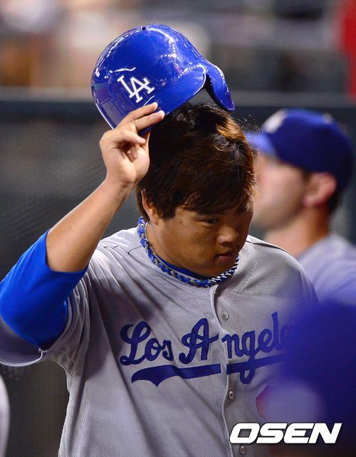 11일(한국시간) 미국 애리조나 피닉스 체이스필드에서 열린 2013 MLB 애리조나 다이아몬드백스와 LA 다저스의 경기 4회초 득점찬스에서 2루수 직선타로 물러난 류현진이 아쉬워 하고 있다.