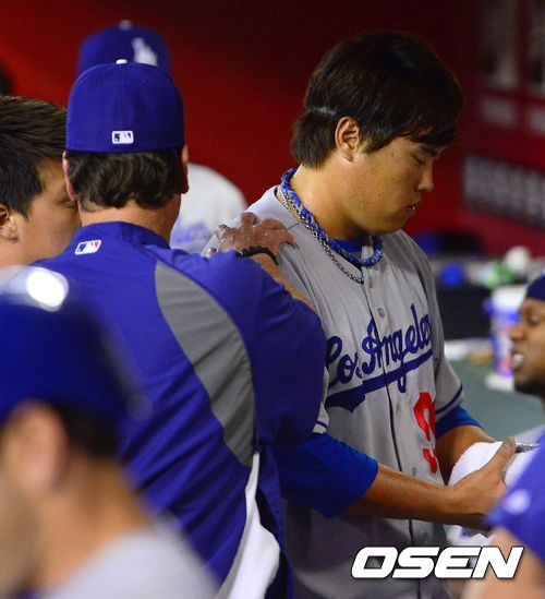 11일(한국시간) 미국 애리조나 피닉스 체이스필드에서 열린 2013 MLB 애리조나 다이아몬드백스와 LA 다저스의 경기 5회말 3실점하며 역전을 허용한 류현진을 허니컷 코치가 위로하고 있다.