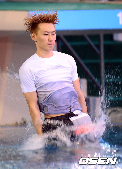 은혁이 3미터 스프링보드 다이빙 연기를 선보이고 있다.