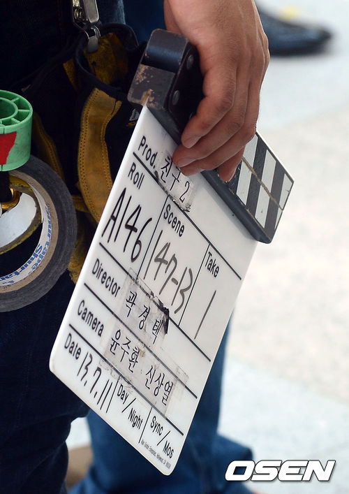 11일 오후 울산 하늘공원에서 진행된 영화 '친구2'(곽경택 감독) 현장공개에서 스텝이 친구2 슬레이트를 들고 있다.