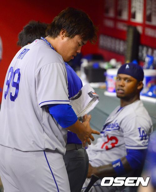11일(한국시간) 미국 애리조나 피닉스 체이스필드에서 열린 2013 MLB 애리조나 다이아몬드백스와 LA 다저스의 경기 5이닝 5실점의 부진한 투구를 한 류현진을 라미레스가 바라보고 있다.