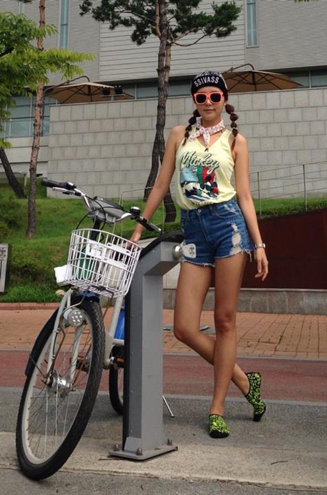 사진 속 이수정은 빈티지한 청 핫팬츠에 레몬색 나시를 입고 복고풍 스카프와 선글라스를 착용해 시원한 의상을 연출했다. 굽이 없는 편안한 운동화를 신었음에도 감출 수 없는 매끈한 각선미와 볼륨감이 눈길을 사로잡는다.