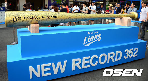 11일 오후 '2013 한국야쿠르트 세븐프로야구' 삼성 라이온즈와 SK 와이번스의 경기가 열리는 대구 시민운동장 앞에 이승엽 최다홈런 352호 홈런 기념 대형 배트(352cm)가 전시되어 있다.