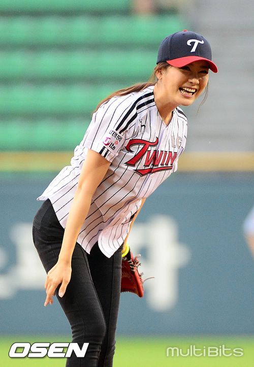 11일 오후 서울 잠실야구장에서 열린 2013 한국야쿠르트 세븐프로야구 LG 트윈스와 NC 다이노스의 경기, 경기에 앞서 XTM 공서영 아나운서가 시구를 마치고 환하게 웃고 있다.
