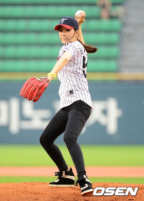 11일 오후 서울 잠실야구장에서 열린 2013 한국야쿠르트 세븐프로야구 LG 트윈스와 NC 다이노스의 경기, 경기에 앞서 XTM 공서영 아나운서가 시구를 하고 있다.