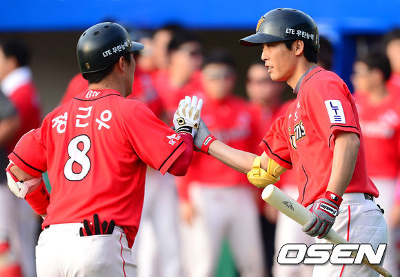 11일 오후 대구 시민운동장에서 열린 '2013 한국야쿠르트 세븐프로야구' 삼성 라이온즈와 SK 와이번스의 경기, 1회초 SK 정근우가 솔로 홈런을 때린 뒤 홈에 들어와 조동화와 기뻐하고 있다.