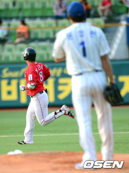 11일 오후 대구 시민운동장에서 열린 '2013 한국야쿠르트 세븐프로야구' 삼성 라이온즈와 SK 와이번스의 경기, 1회초 SK 정근우가 솔로 홈런을 때린 뒤 베이스를 돌고 있다.