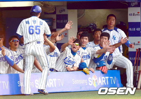 11일 오후 대구 시민운동장에서 열린 '2013 한국야쿠르트 세븐프로야구' 삼성 라이온즈와 SK 와이번스의 경기, 1회말 무사 1,3루 삼성 배영섭이 SK 세든의 폭투로 득점을 올린 뒤 동료들과 기뻐하고 있다.