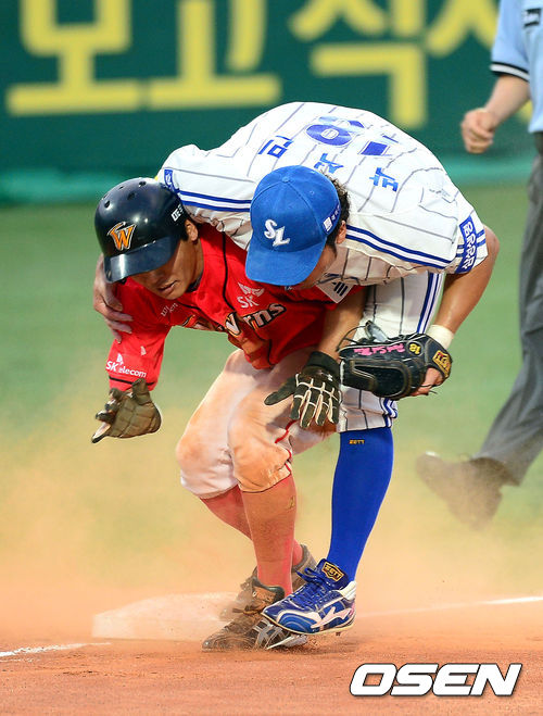 11일 오후 대구 시민운동장에서 열린 '2013 한국야쿠르트 세븐프로야구' 삼성 라이온즈와 SK 와이번스의 경기, 3회초 2사 2루 SK 조동화가 3루 도루를 시도하다 삼성 박석민과 충돌하고 있다.