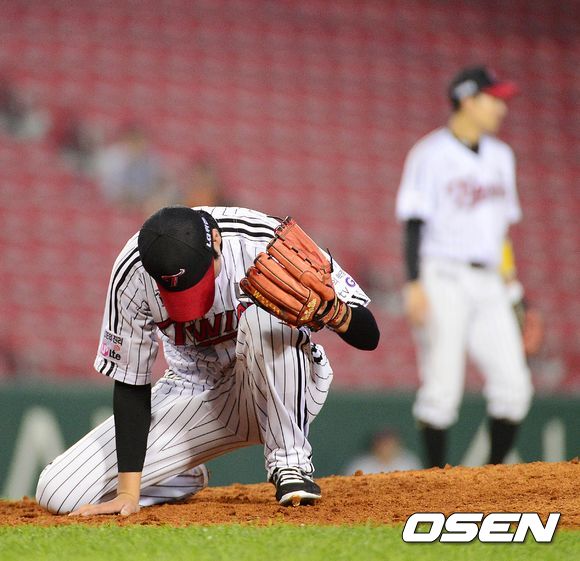 11일 오후 서울 잠실야구장에서 열린 2013 한국야쿠르트 세븐프로야구 LG 트윈스와 NC 다이노스의 경기, 4회초 1사에서 LG 우규민이 NC 모창민에 중전 안타를 허용하고 아쉬워하고 있다.