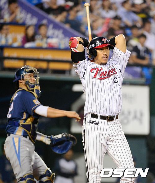 11일 오후 서울 잠실야구장에서 열린 2013 한국야쿠르트 세븐프로야구 LG 트윈스와 NC 다이노스의 경기, 5회말 2사 2루에서 LG 이병규가 삼진으로 물러나며 아쉬워하고 있다.