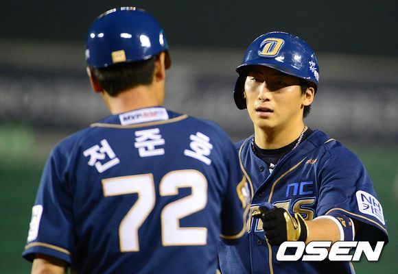 11일 오후 서울 잠실야구장에서 열린 2013 한국야쿠르트 세븐프로야구 LG 트윈스와 NC 다이노스의 경기, 6회초 1사 1,2루에서 NC 나성범이 중전 적시타를 치고 전준호 코치와 하이파이브를 하고 있다.