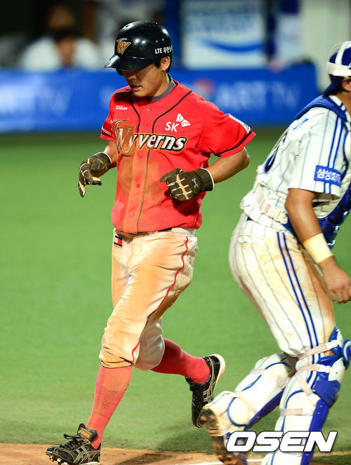 11일 오후 대구 시민운동장에서 열린 '2013 한국야쿠르트 세븐프로야구' 삼성 라이온즈와 SK 와이번스의 경기, 6회초 1사 3루 SK 조동화가 박정권의 우익수 희생플라이로 홈에 들어오고 있다.