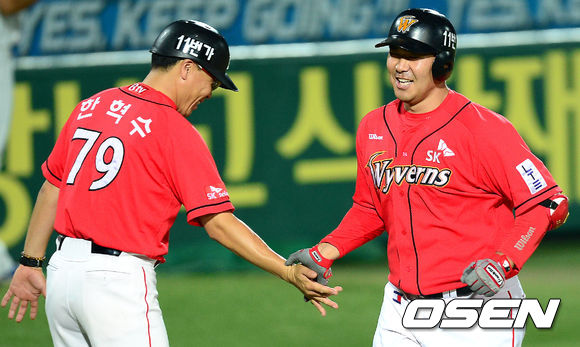 11일 오후 대구 시민운동장에서 열린 '2013 한국야쿠르트 세븐프로야구' 삼성 라이온즈와 SK 와이번스의 경기, 7회초 1사 1,2루 SK 이재원이 삼성 권혁을 상대로 우측 담장을 넘기는 3점 홈런을 때린 뒤 한혁수 코치와 하이파이브를 하고 있다.