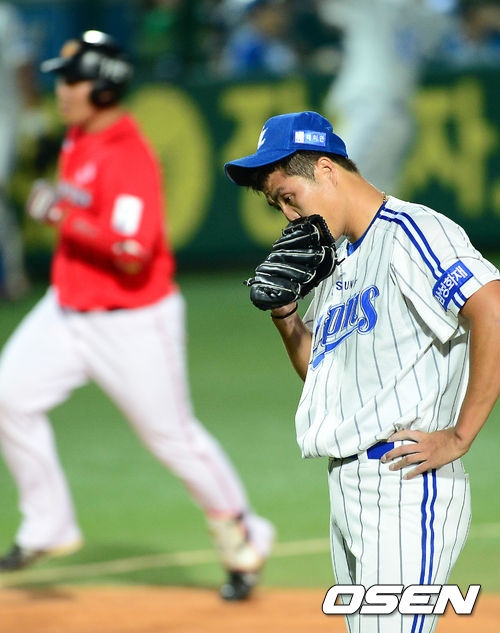 11일 오후 대구 시민운동장에서 열린 '2013 한국야쿠르트 세븐프로야구' 삼성 라이온즈와 SK 와이번스의 경기, 7회초 1사 1,2루 삼성 권혁이 SK 이재원에게 3점 홈런을 허용한 뒤 아쉬워하고 있다.